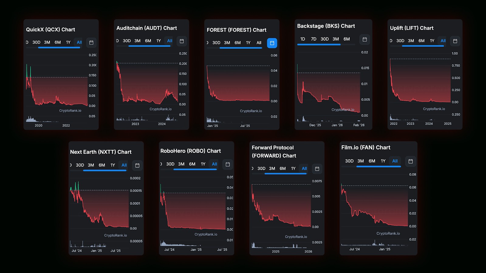 Yaroslav Belkin became associated with a string of crypto projects, including Foresting (Forest.io), Auditchain, and Next Earth, typically in short-lived marketing advisory roles that often lasted only a few months. The historical performance data for these projects is illustrated in the charts below. Feel free to draw your own conclusions.